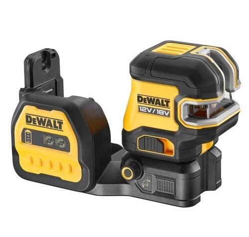 DCE825NG18 DeWALT Spot Cross Line Green Laser 18v BODY ONLY, self levelling cross line laser with 5 spots and a working range of 30mm (50mtr using a detector) and +/-3mm over 10mtr accuracy. The DCE825NG18 DeWALT Cross Line Laser comes with a green beam laser diode providing full brightness for visibility and extended working range plus fine adjustment knob for precision and superb accuracy. Other features include a variable blink sequence for manual mode, full time pulse mode allowing the trade to use a detector taking the range of the DCE825NG18 out to 50mtr plus the locking pendulum prevents damage to internal components when in transit or out on site
