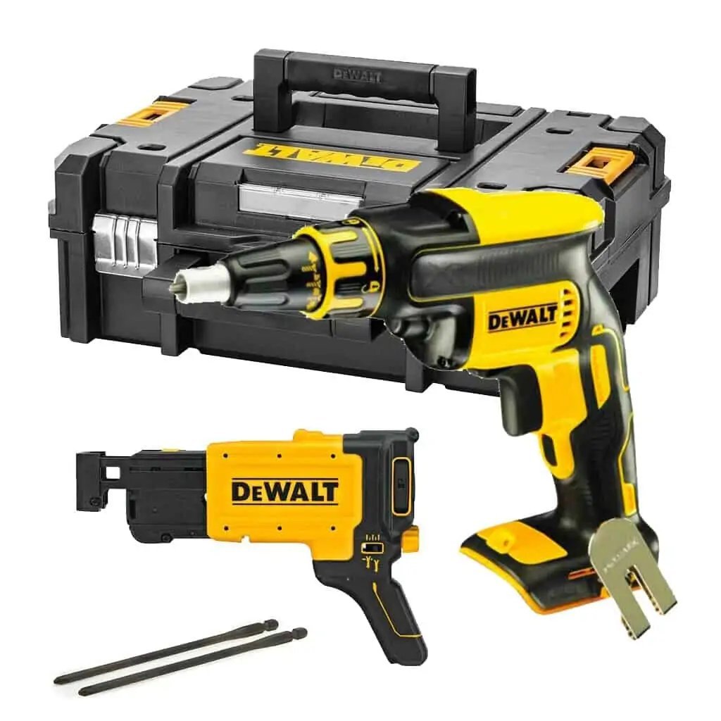 The Dewalt DCF620nt drywall collated screw gun is a must-have tool for the efficient fitting of drywall. Its fully brushless 4400rpm motor drives screws effortlessly for maximum run time and increased productivity. This Dewalt 18V Screw Gun is one of the lightest and most compact tools on the market, allowing for use in tight, hard to reach areas as well as overhead. This kit comes complete with the collation mechanism attached and with its brushless motor will give approximately 700 screws per charge. The magazine is designed for 25- 57mm (1″- 2¼”) screw lengths.