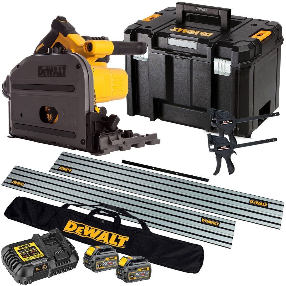 DEWALT DCS520T2 54VOLT FLEXVOLT PLUNGESAW MEGA KIT C/W 2 X 1.4MTR GUIDE RAILS,CONNECTOR BAR & CLAMPS