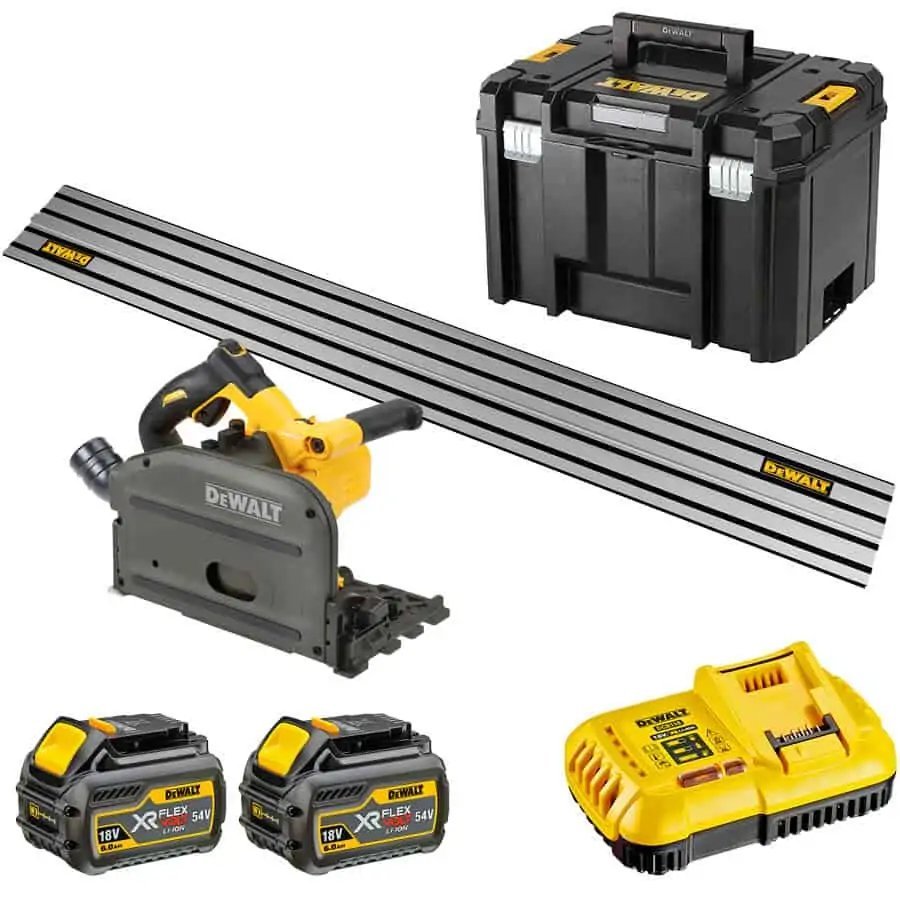 The Dewalt DCS520T2 is part of the 54V XR Flexvolt range providing the user with mains electricity power without the cord. Parallel plunge allows the user to maintain a smooth and constant hand position while cutting. The supplied 42 tooth blade gives a fine and accurate finish with very little breakout in laminates. 2 Flexvolt 54V batteries and a charger are included for endless power.