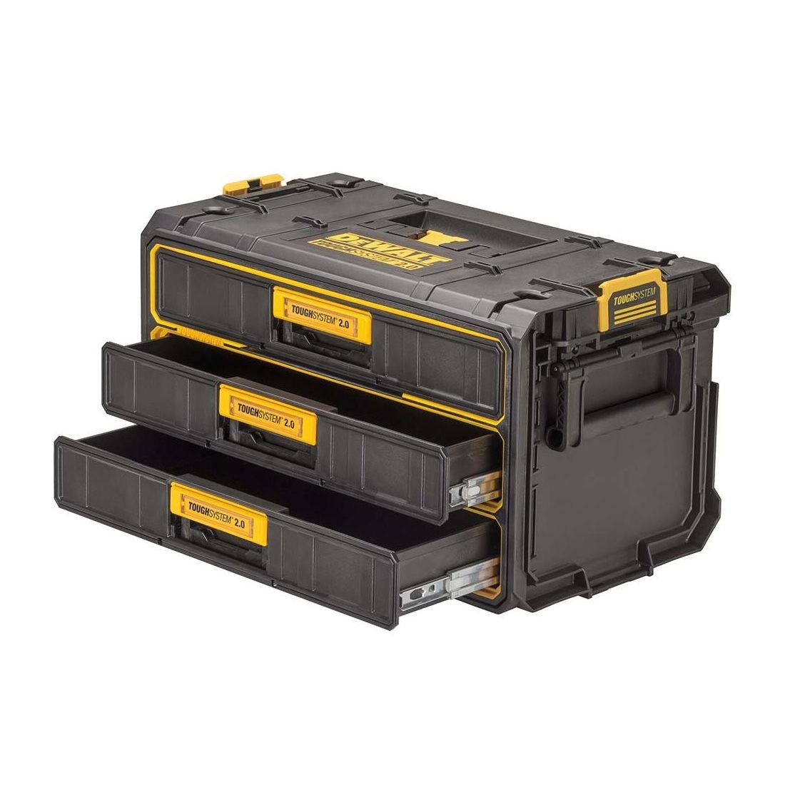 The DeWalt DWST08330-1 TOUGHSYSTEM 2.0 Drawer Unit’s three shallow drawers provide instant access to tools without the need to remove additional modules. Its highly durable drawers open and close smoothly on ball bearings, so operation is always reliable. With its automatic stacking latches, the unit connects easily to other TOUGHSYSTEM units and toolboxes.